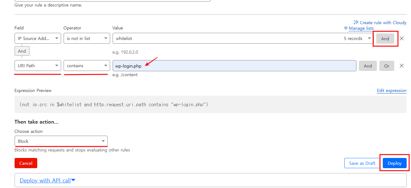 이렇게 설정 시 요청 경로에 wp-login.php가 포함되어 있으면 내가 등록한 화이트 아이피 이외 모든 아이피는 차단됩니다.