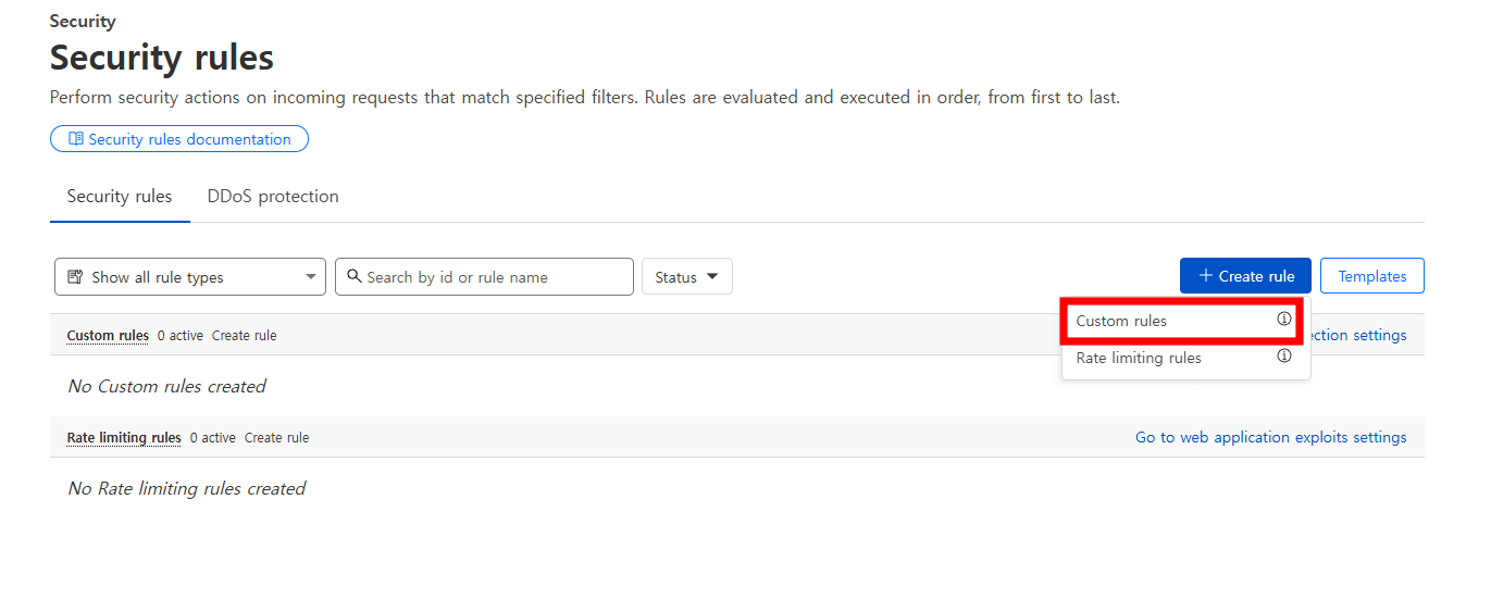 Security rules로 이동했다면 오른쪽에 Create rule 버튼을 클릭 후 Custom rules버튼을 클릭해 주세요