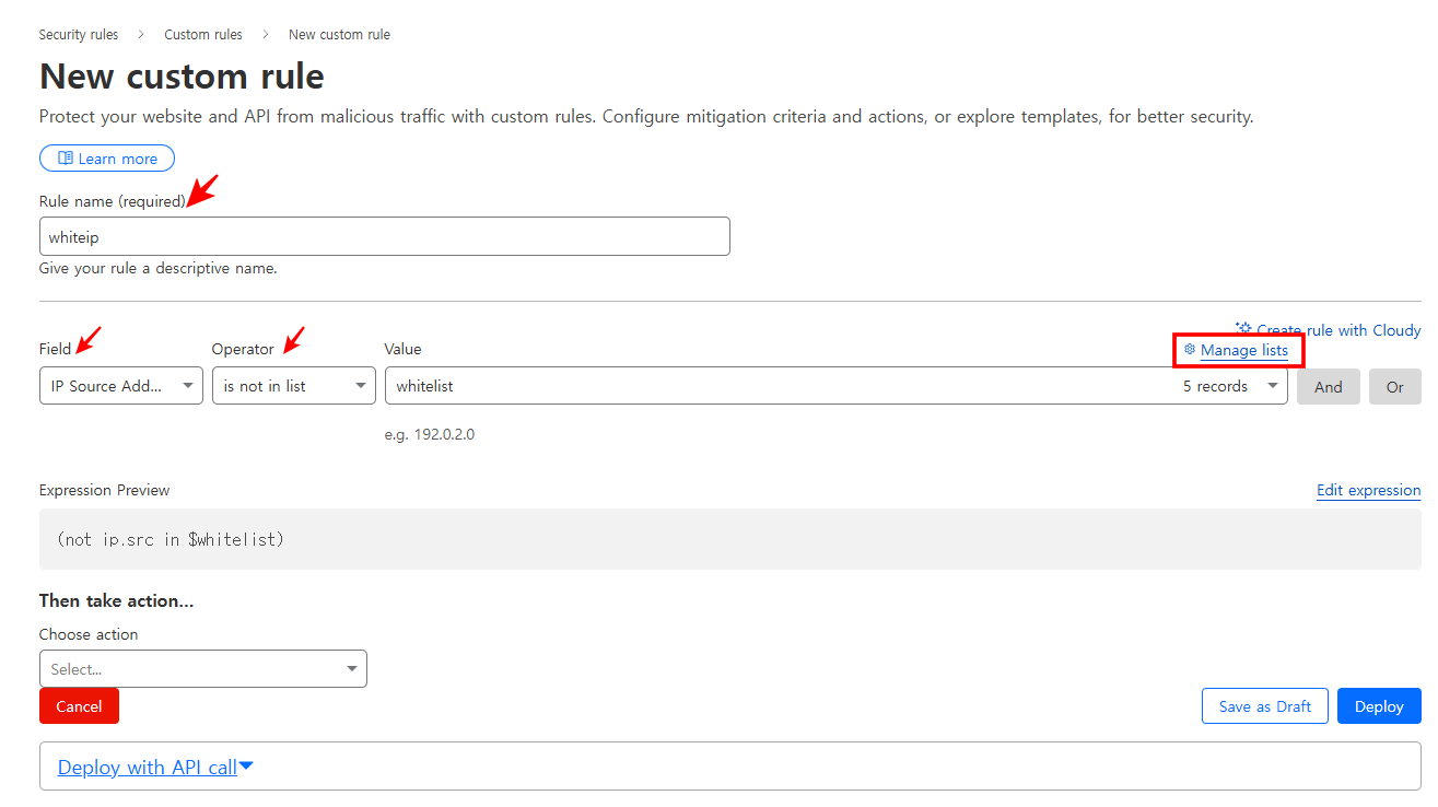 여기까지 끝났으면 choose action에서 block를 설정하신 뒤 deploy 하면 완료입니다.